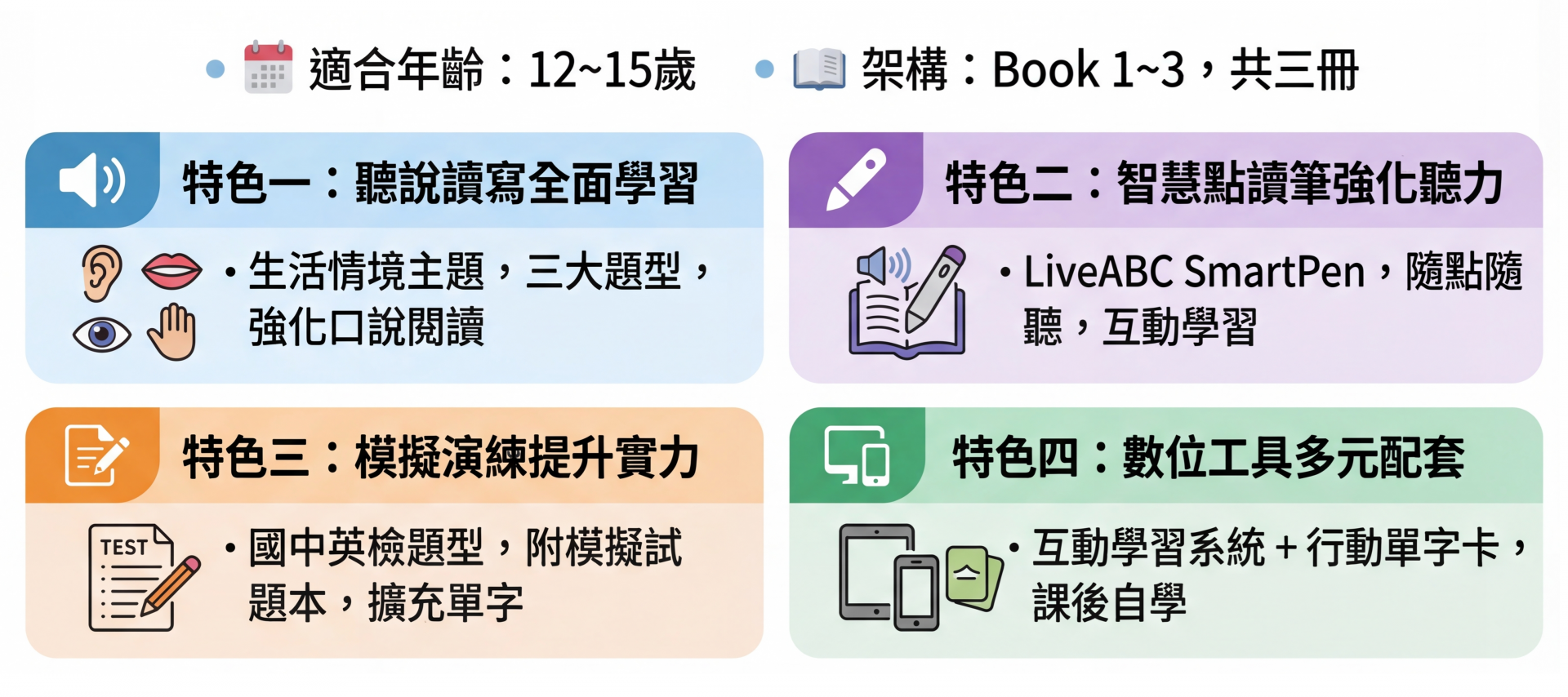 LiveABC 獨家研發,專為 12~15 歲學生設計的全民英檢初級準備教材,全系列共三冊,符合 CEFR A1~A2 指標。