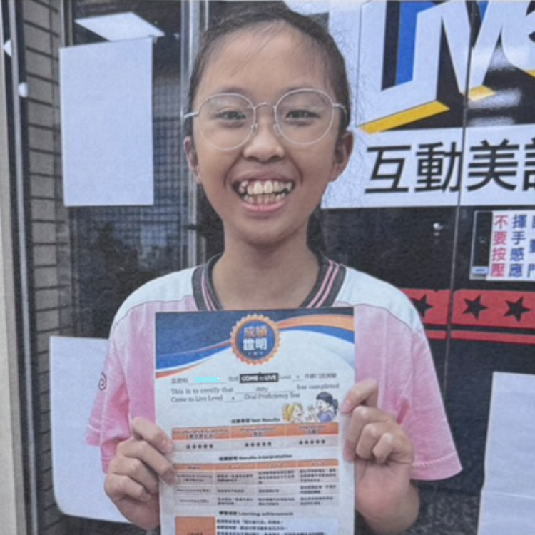剛開始上 LiveTalk 的時候,我有一點緊張,怕自己講錯英文。可是AI卡通人物很好玩,會提示我要講哪些句子,讓我慢慢敢開口。現在我最大的改變是,不再害羞,會主動講英文,發音也變清楚了。以後我想邀請表姊一起來上 LiveTalk,這樣我們就能一起快樂學英文。