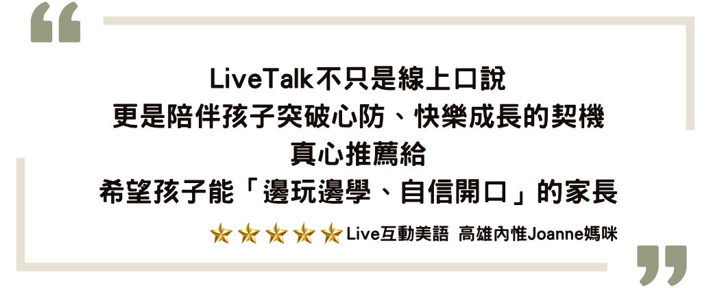 LiveTalk 不只是線上口說,更是陪伴孩子突破心防、快樂成長的契機。真心推薦給希望孩子能「邊玩邊學、自信開口」的家長。