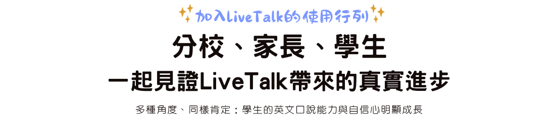 導入LiveTalk口說平台及每月2堂口說課後,孩子們與老師的互動性及開口說的自信心,明顯看得出來提升的成效。